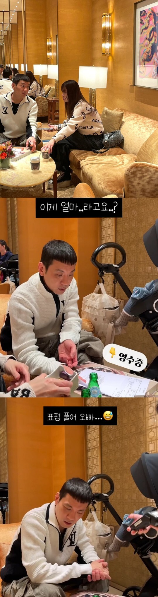 이어 경맑음은 팔찌 가격을 듣고 동공 지진을 일으키는 정성호의 모습이 담긴 영상도 공개했다. 영수증을 확인한 정성호는 당황한 표정을 짓지만 이내 아내를 위해 기꺼이 결제에 나서는 모습. 이에 경맑음은 "오빠 고마워"라는 자막을 덧붙였다.